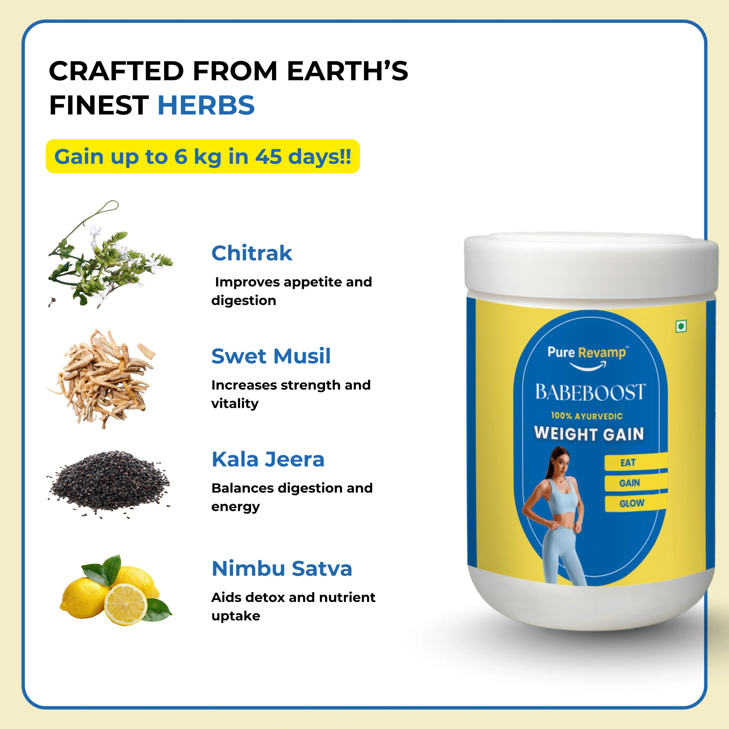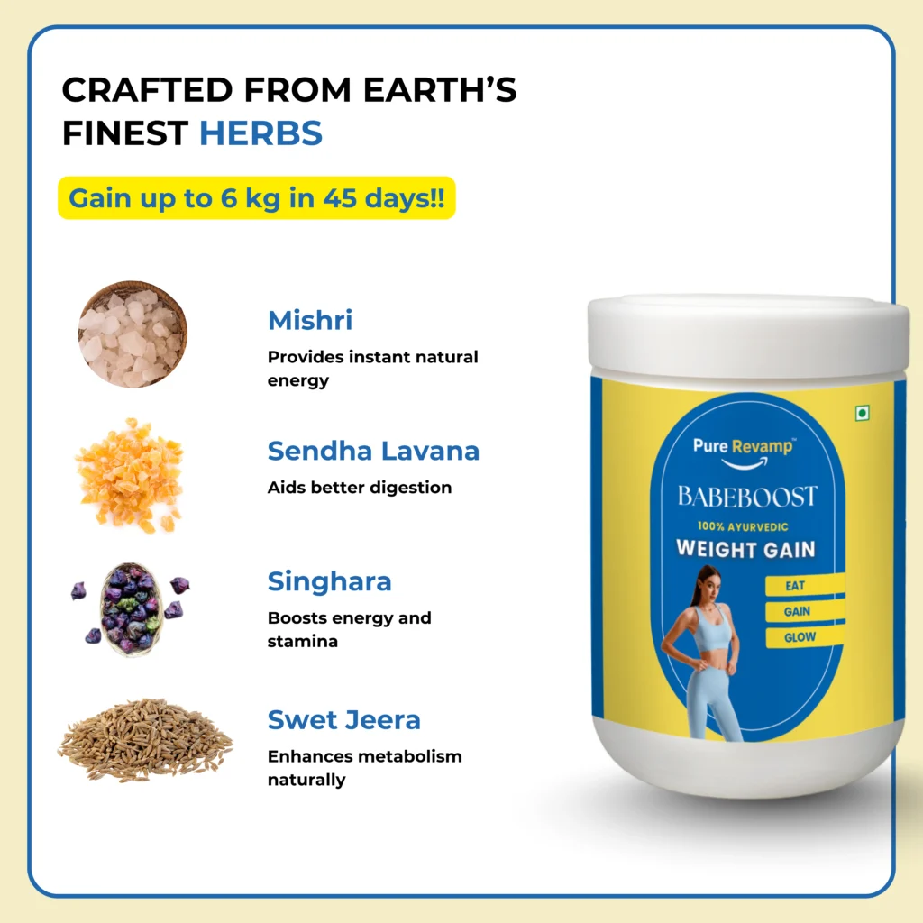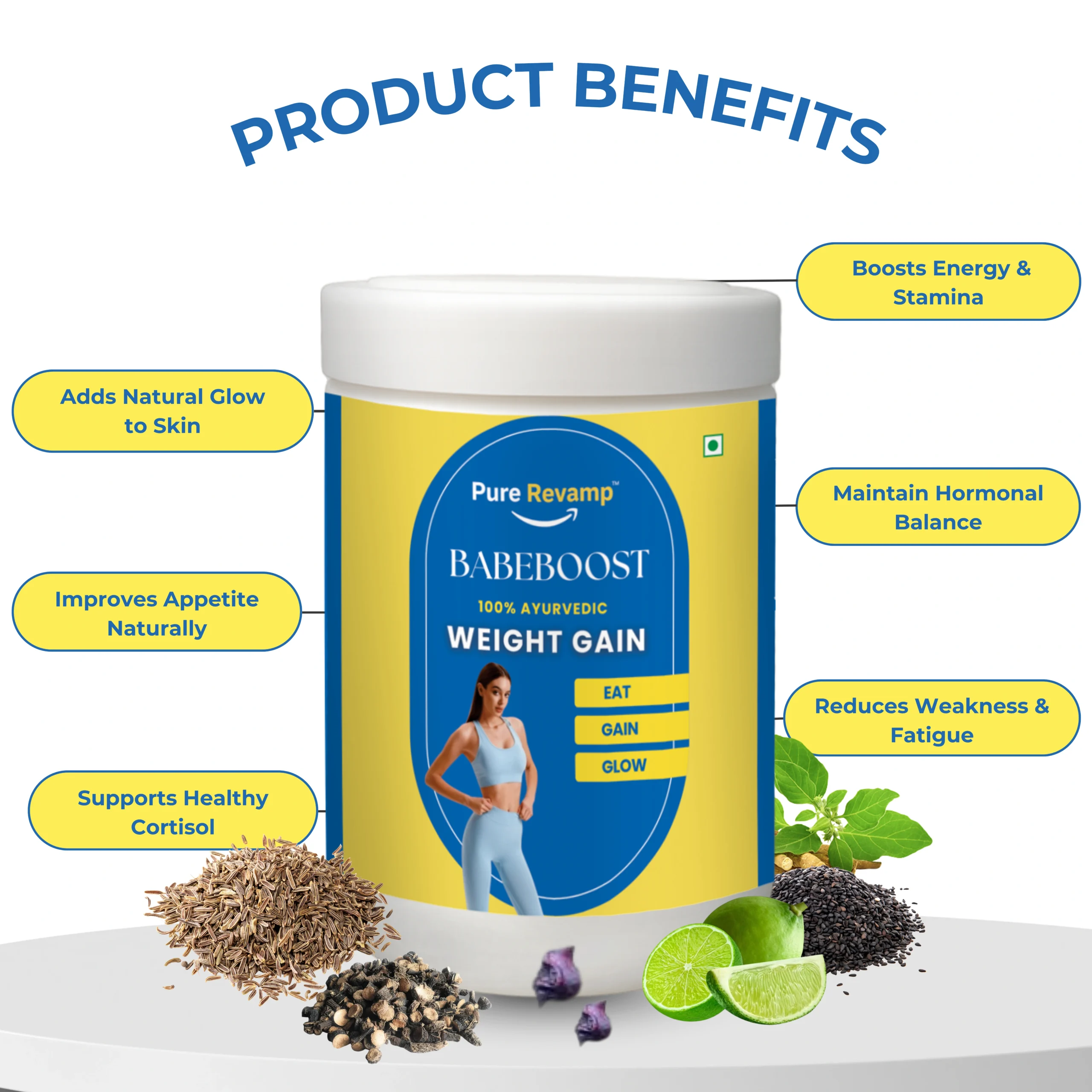 Tired of trying everything but still not gaining? Pure Revamp BabeBoost is crafted especially for women who face challenges like low appetite, fast metabolism, or hormonal imbalance. This nutrient-dense powder supports healthy weight gain by improving appetite, enhancing energy, and nourishing natural curves. Its gentle, effective formula helps your body respond the way you want, naturally.