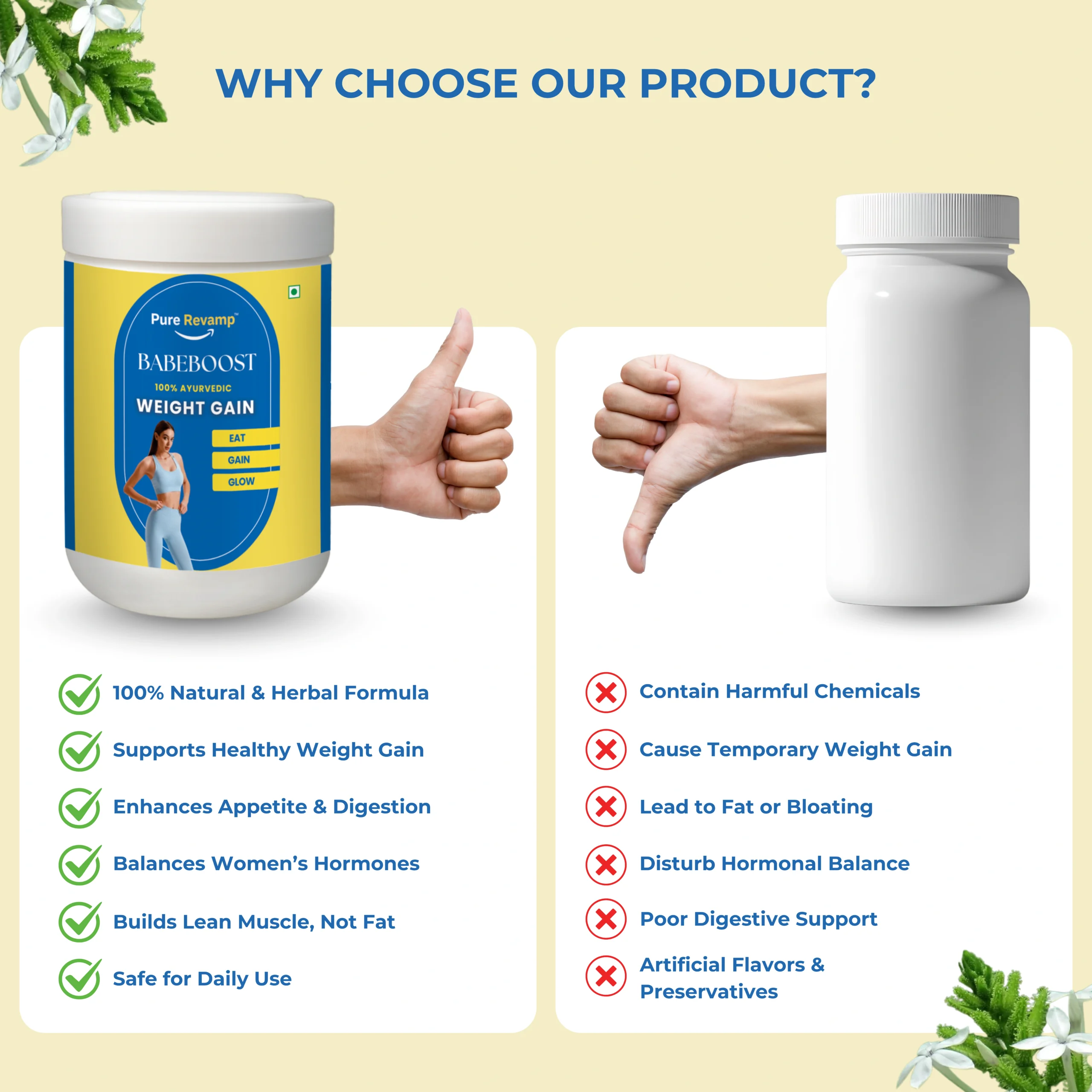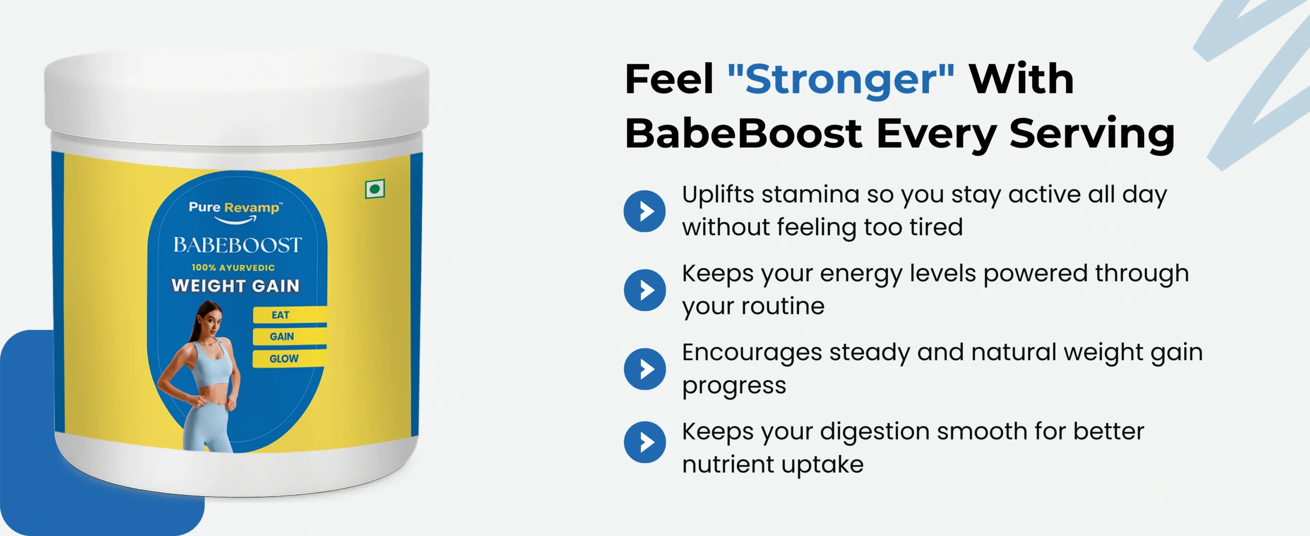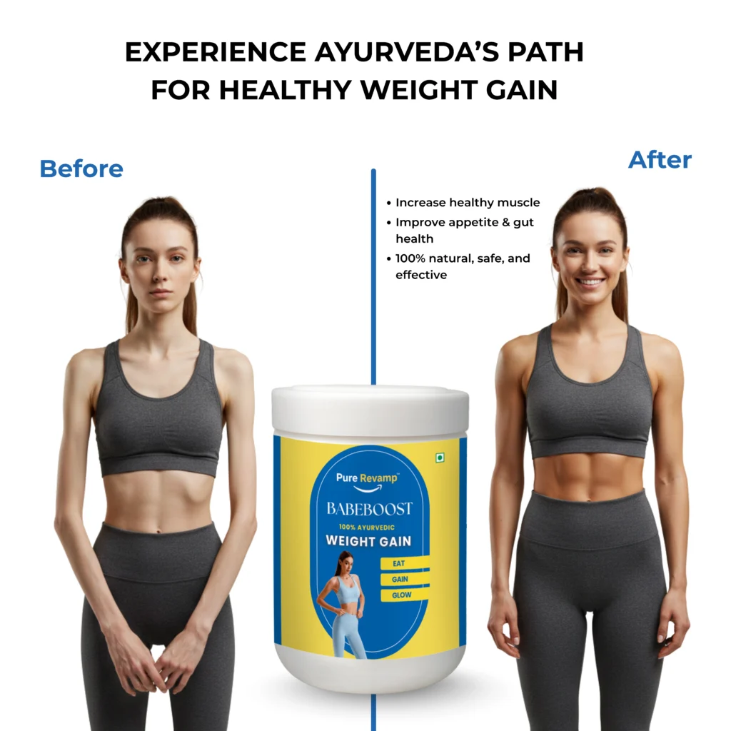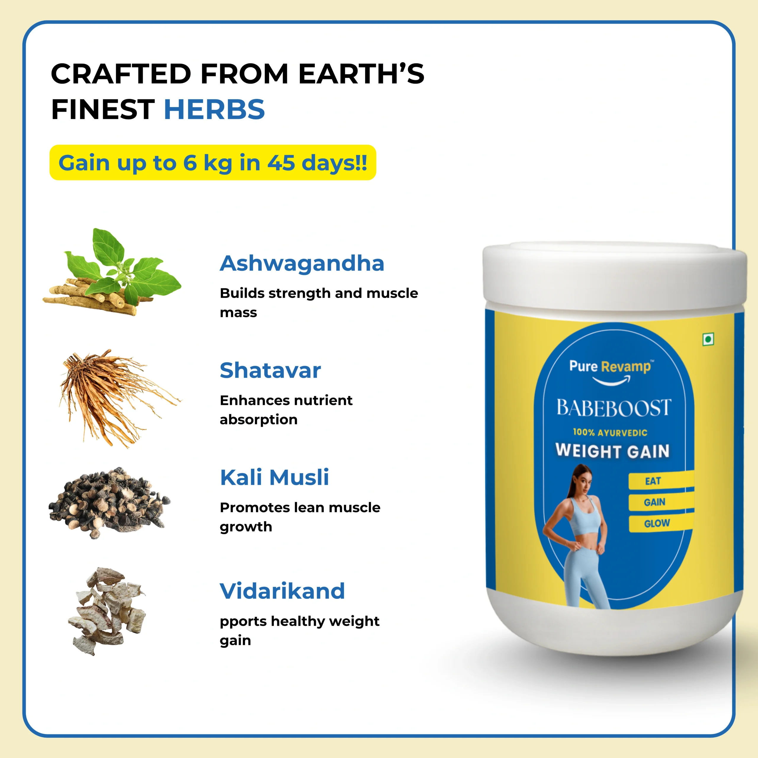 Tired of trying everything but still not gaining? Pure Revamp BabeBoost is crafted especially for women who face challenges like low appetite, fast metabolism, or hormonal imbalance. This nutrient-dense powder supports healthy weight gain by improving appetite, enhancing energy, and nourishing natural curves. Its gentle, effective formula helps your body respond the way you want, naturally.