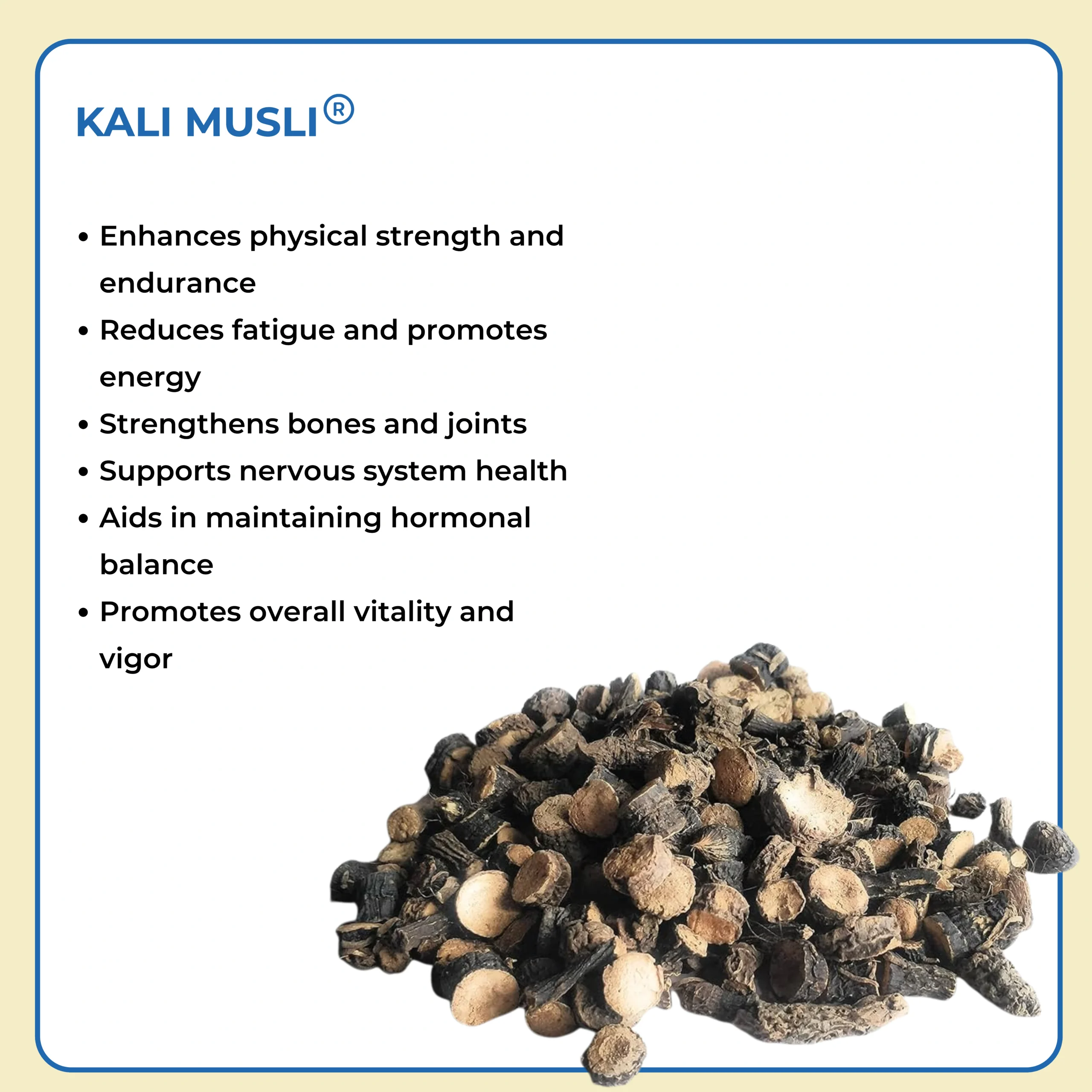 Kali Musli helps enhance appetite, improve metabolism, and its nourishing properties help the body hold on to a healthy weight and energy.