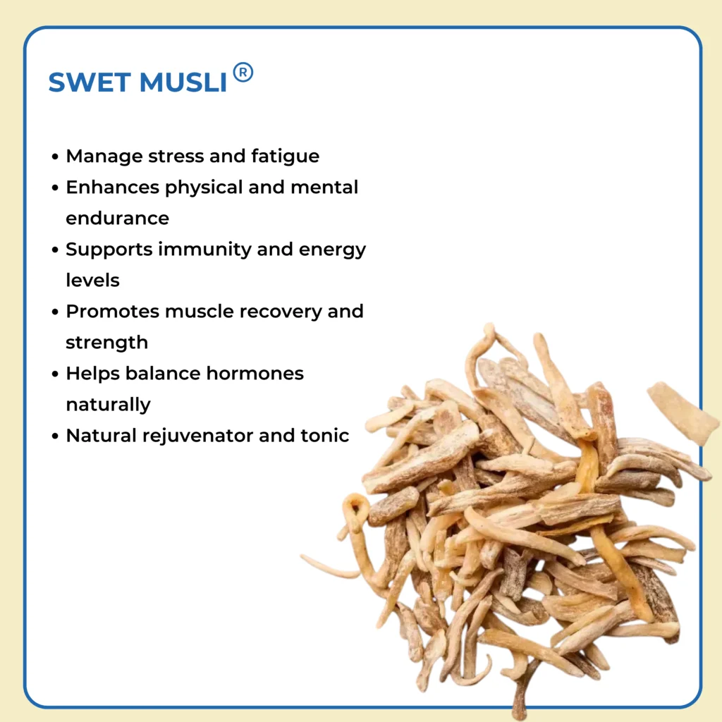 Swet Musli enhances stamina, boosts energy levels, improves the body’s ability to utilize nutrients, and its natural anabolic effects help women build healthy body mass steadily.