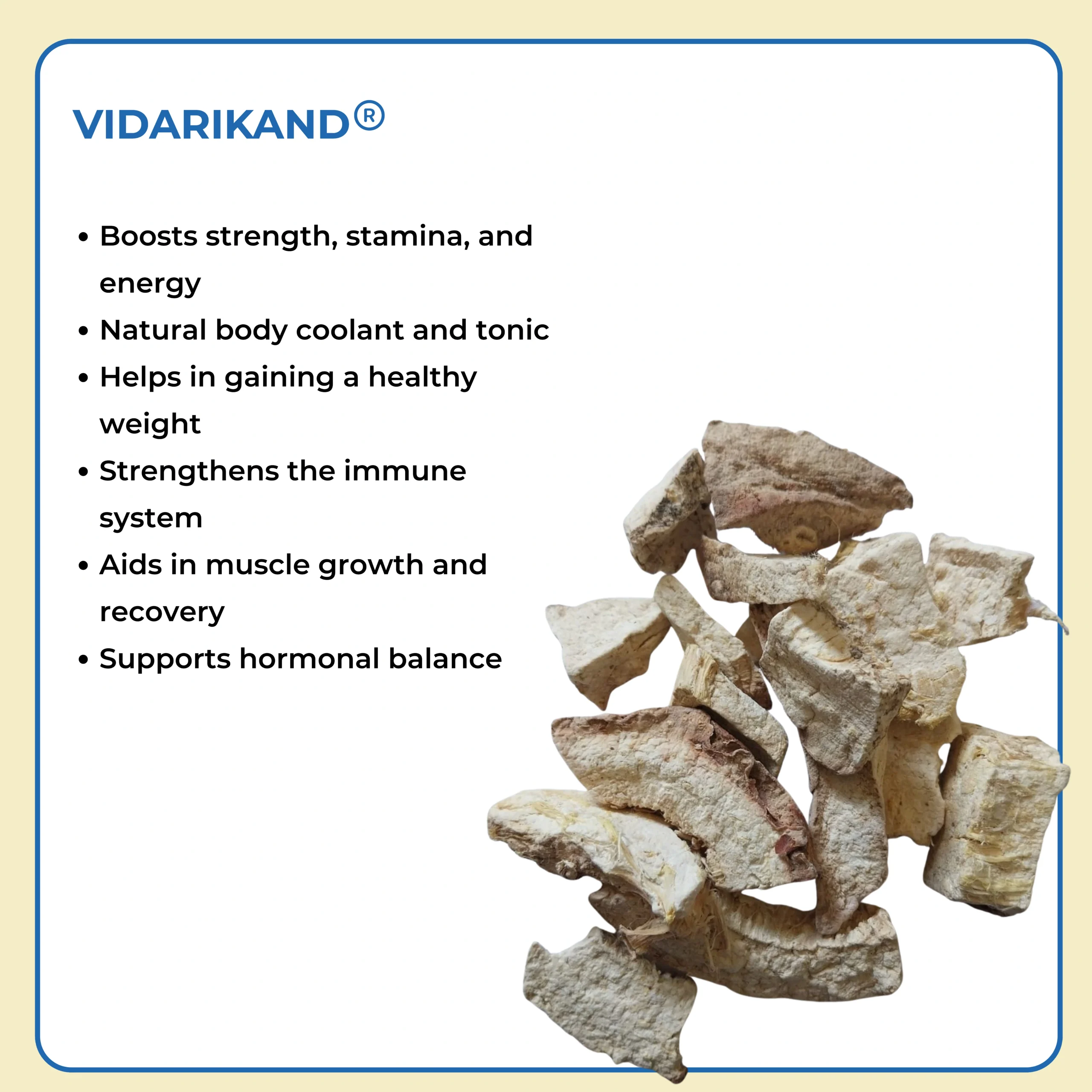 Vidarikand nourishes body tissues, supports female reproductive health, and improves strength. It provides natural nourishment to promote healthy gain.