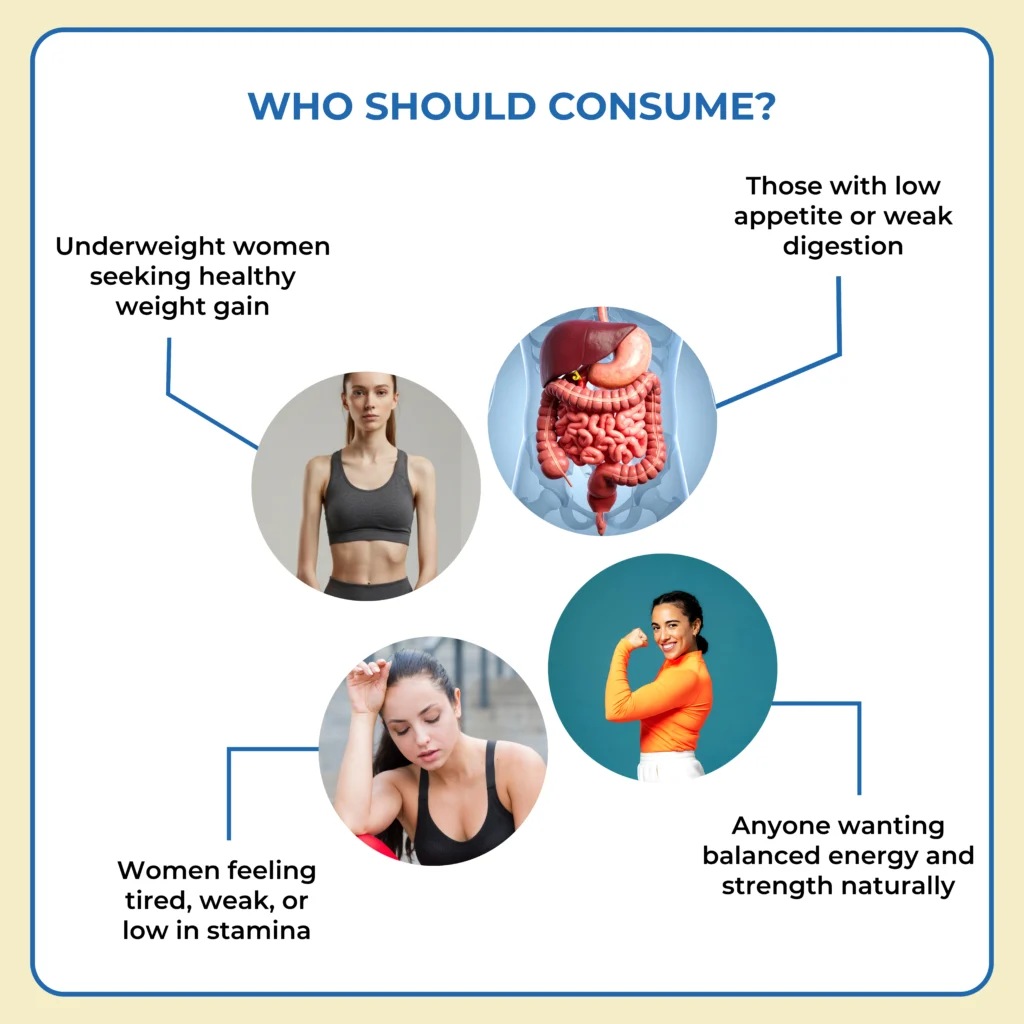 By supporting appetite and enhancing the absorption of minerals, Sendha Lavana facilitates a smoother path for steady gain in women.