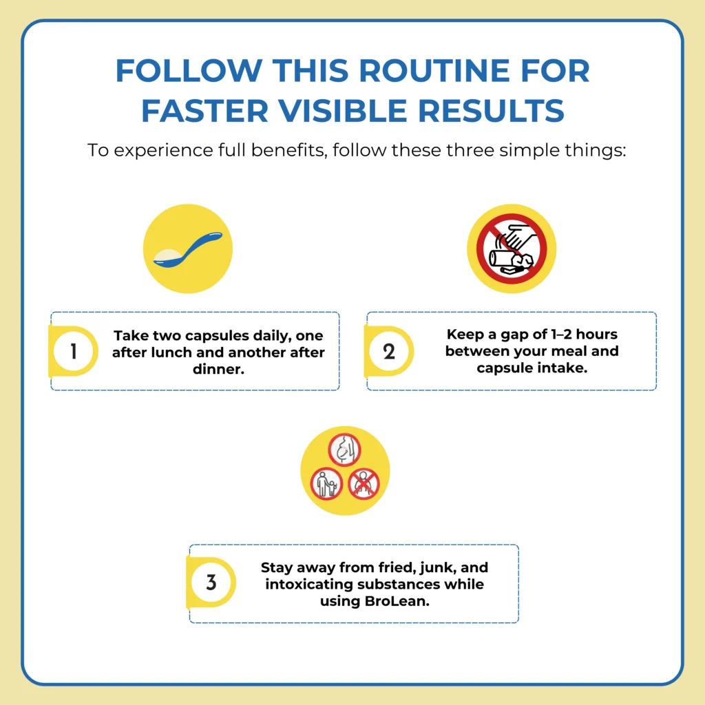 Consume one capsule post-lunch and the second after dinner, accompanied by a full glass of water. To help your body utilize the ingredients efficiently, keep a 1–2 hour window between BroLean and your meals.